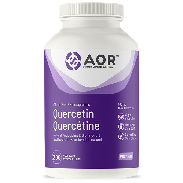 AOR Quercetin - Quercetin is the flavone aglycone (non-sugar-bound) form of the polyphenolic flavonoid rutin. It is the major bioflavonoid in the human diet. Quercetin's main application is for those with allergy symptoms (such as itchy eyes, itchy throat, sneezing and nasal congestion), quercetin also promotes cardiovascular health due to its antioxidant and anti-inflammatory effects. It reduces the oxidation of low density lipoproteins (LDL), promotes healthy blood pressure and blood clotting, enhances nitric oxide (NO) production, and reduces the risk of metabolic syndrome. Quercetin can provide relief from headaches and other types of pain, as it inhibits the production of inflammatory signaling molecules by a mechanism similar to that of aspirin. Quercetin also inhibits the release of histamine from certain immune cells, hence why it is widely used by those who suffer from constant allergies (such as dust) and seasonal allergies (such as hay fever).