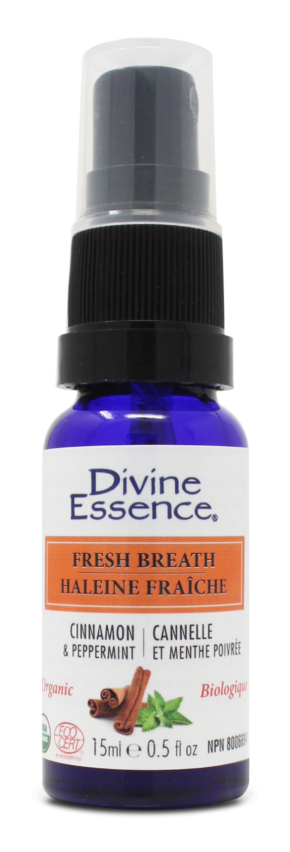Divine Essence Fresh Breath - Cinnamon & Peppermint - With its 100% organic concentrated formula that naturally eliminates bad breath and provides digestive comfort, Divine Essence breath freshener is made with olive oil and essential oils specially selected for their great taste and strong antiseptic and carminative properties. Sugar and alcohol-free.