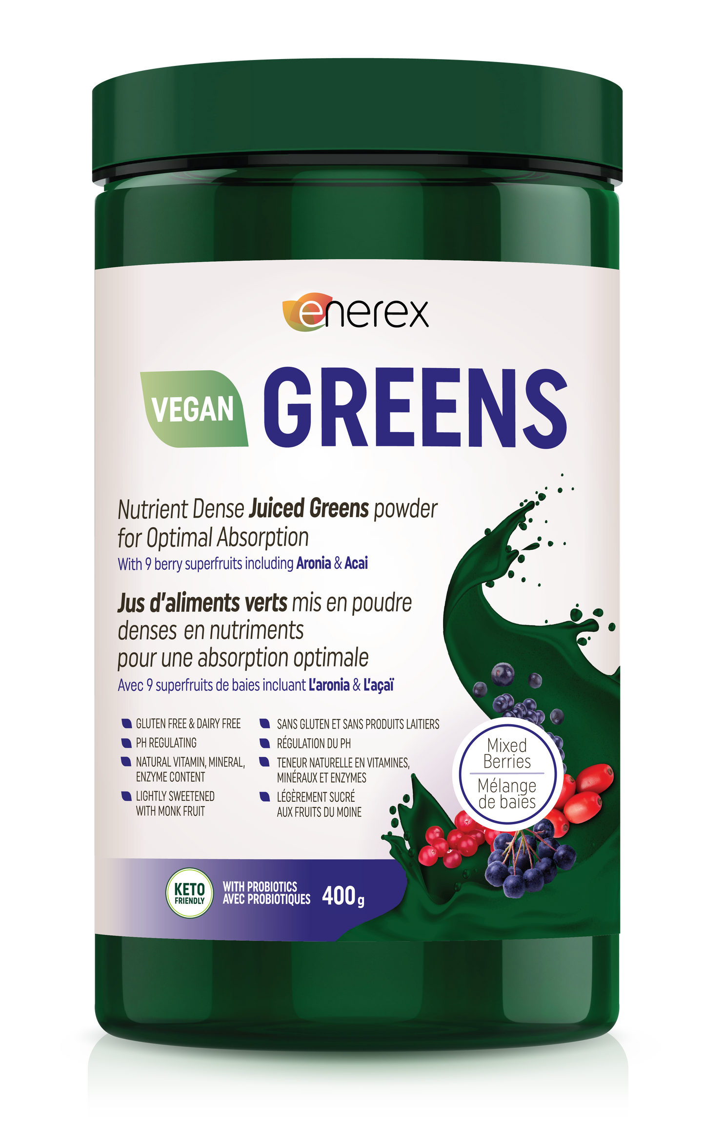 Enerex Greens - Mixed Berries - Loaded with Superfoods that will increase your energy, and keep your kids’ immune systems strong. This formula is boosted with 9 Superberries that not only add great taste, they’re packed with vitamins, minerals and antioxidants. Enerex Greens Mixed Berries adds the powdered juices of organic kamut grass, barley grass and oat grass for their disease-fighting vitamins, and alfalfa and spirulina (blue green algae) for their life-giving chlorophyll. The formula supplies soya lecithin for essential fats, apple fibre pectin and brown rice bran for fibre, beet juice powder as a detoxifier, and organic millet sprouts for cholesterol reduction and protein. Included are special human strain, dairy-free probiotics that don’t need to be refrigerated. This blend’s Superberries, researched and renowned for their high antioxidant and anti-inflammatory properties, include: Aronia Berry, Organic Raspberry, Acerola Berry, Organic Black Currant, Organic Cranberry, Organic Acai Berry, Organic Strawberry, Organic Blueberry, and Organic Raw Goji Berry.