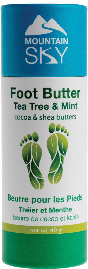 Mountain Sky Foot Butter - Tea Tree & Mint - Natural foot butter to rescue dry feet. Dry feet can be problematic as it can cause skin cracking and infections. Unlike the skin on the rest of the body, your feet are not lubricated by oil glands. Your feet rely on hundreds of thousands of sweat glands to keep your feet feeling moisturized. As you age, your feet sweat less which can cause dry itchy feet. Mountain Sky Foot Butter features 100% Canadian beeswax, cocoa & shea butters and coconut, rice & sesame oils. Each butter and oil has been added to soften, tone, and enrich the skin. Tea tree’s antiseptic qualities and mint’s rejuvenating tingle will keep your feet toned and supple.