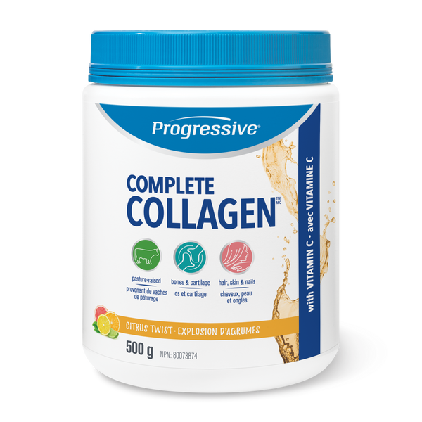 Progressive Complete Collagen - Citrus Twist - Non-GMO hydrolyzed collagen from pasture-raised, grass-fed cows that are free from antibiotics and added hormones. Collagen contains essential amino acids which help with connective tissue formation and maintain healthy bones, cartilage, teeth and gums. Collagen also helps in maintaining healthy hair, skin and nails. Complete Collagen has added Vitamin C which helps with collagen absorption.